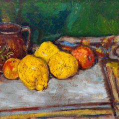 Natură moartă cu gutui, ulei pe carton, 38,5 × 60,5 cm, 1954